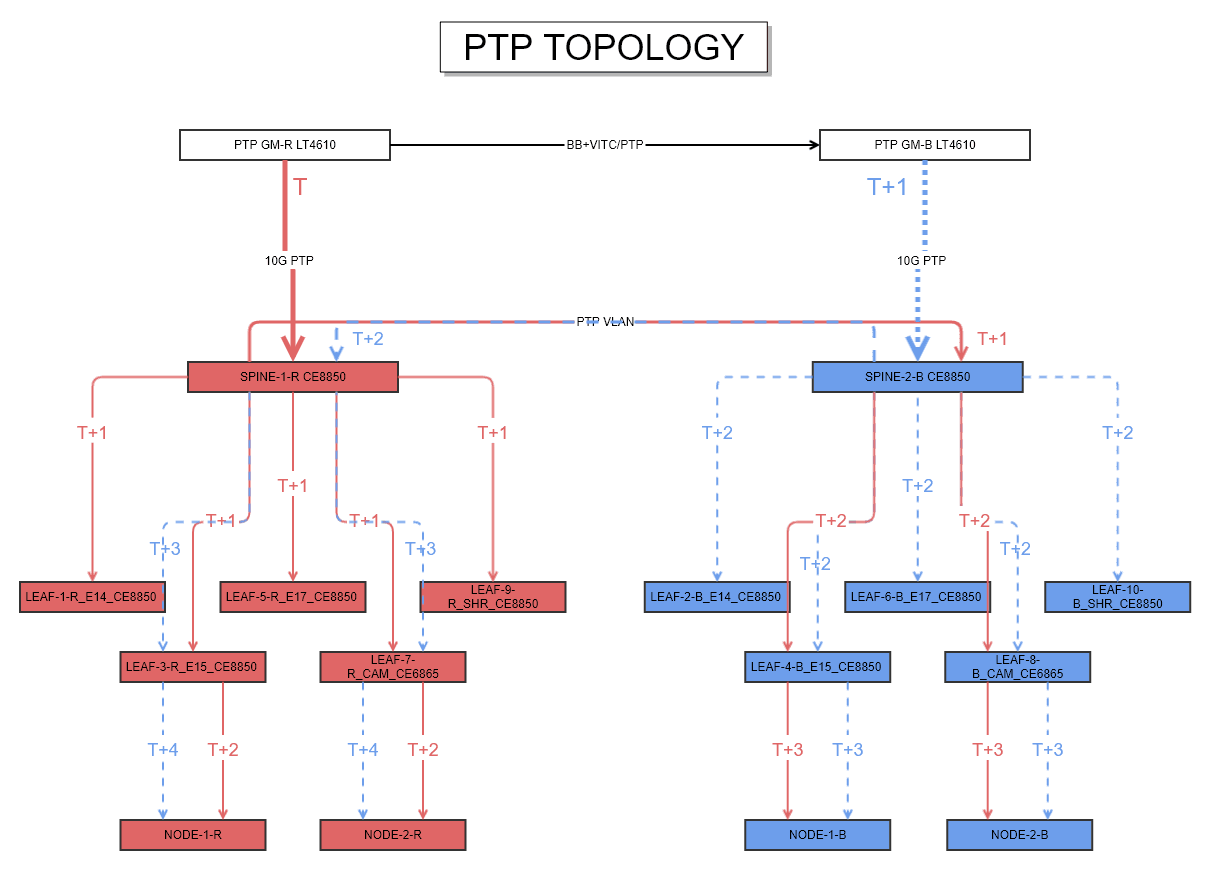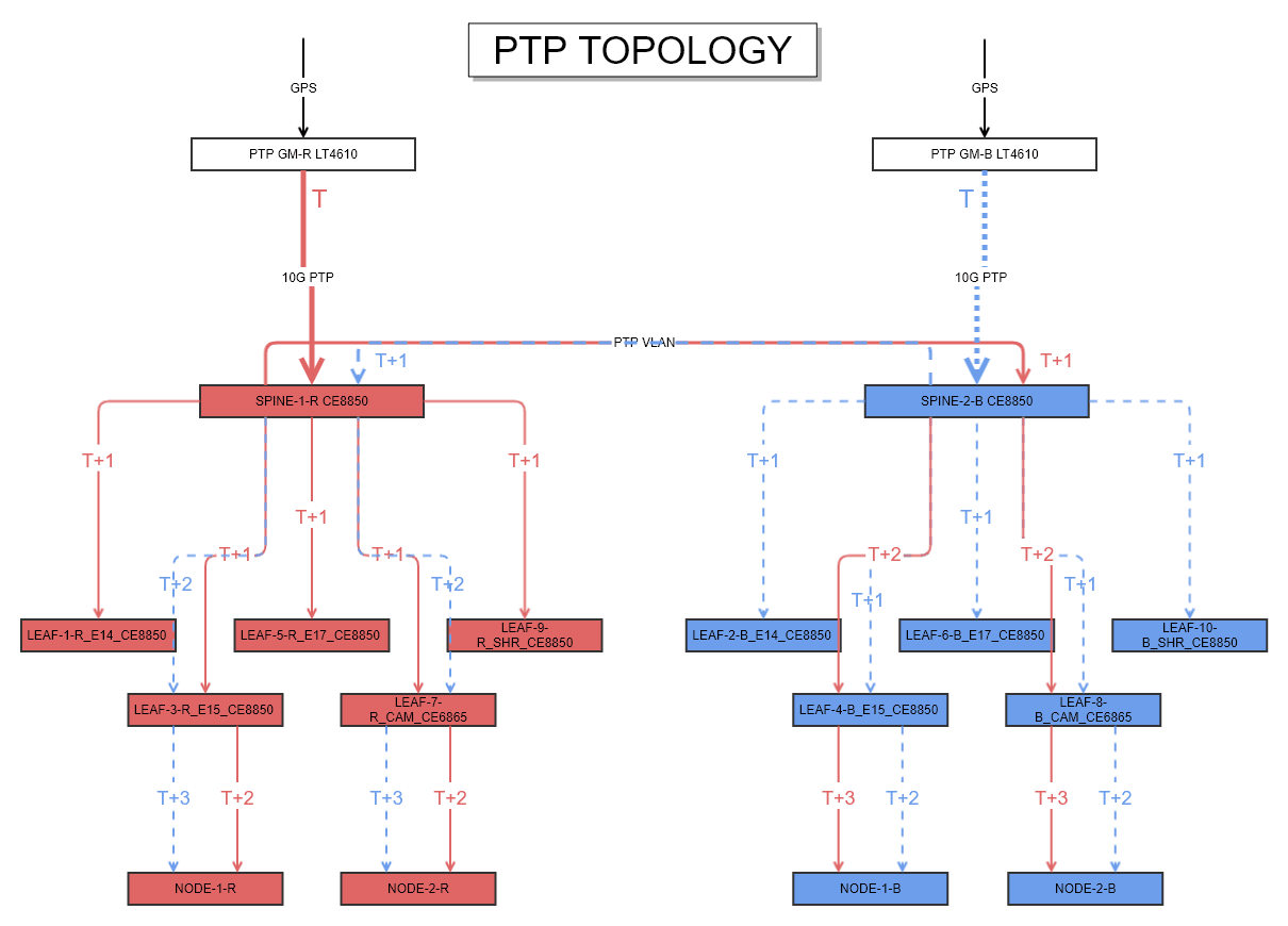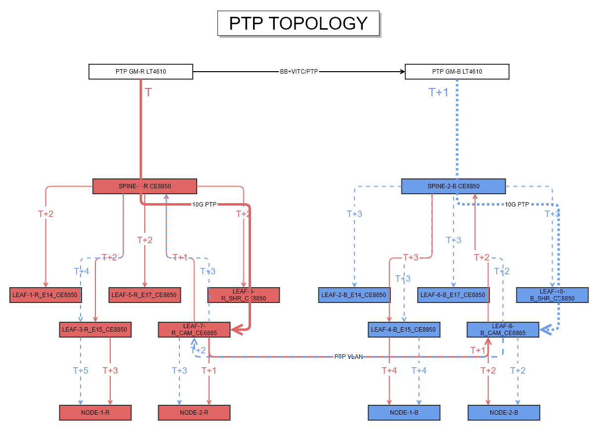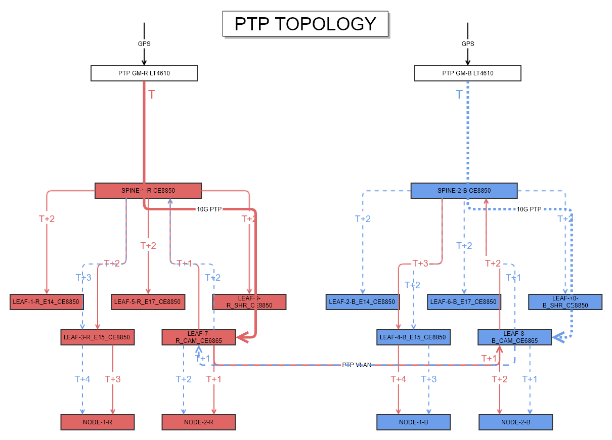 - 终端设备(如NODE-1)的主信号((NODE-1-R)或者备信号(NODE-1-B))都能收到主PTP(PTP GM-R)和备PTP(PTP GM-B),但是主备PTP时间存在稍许查别。